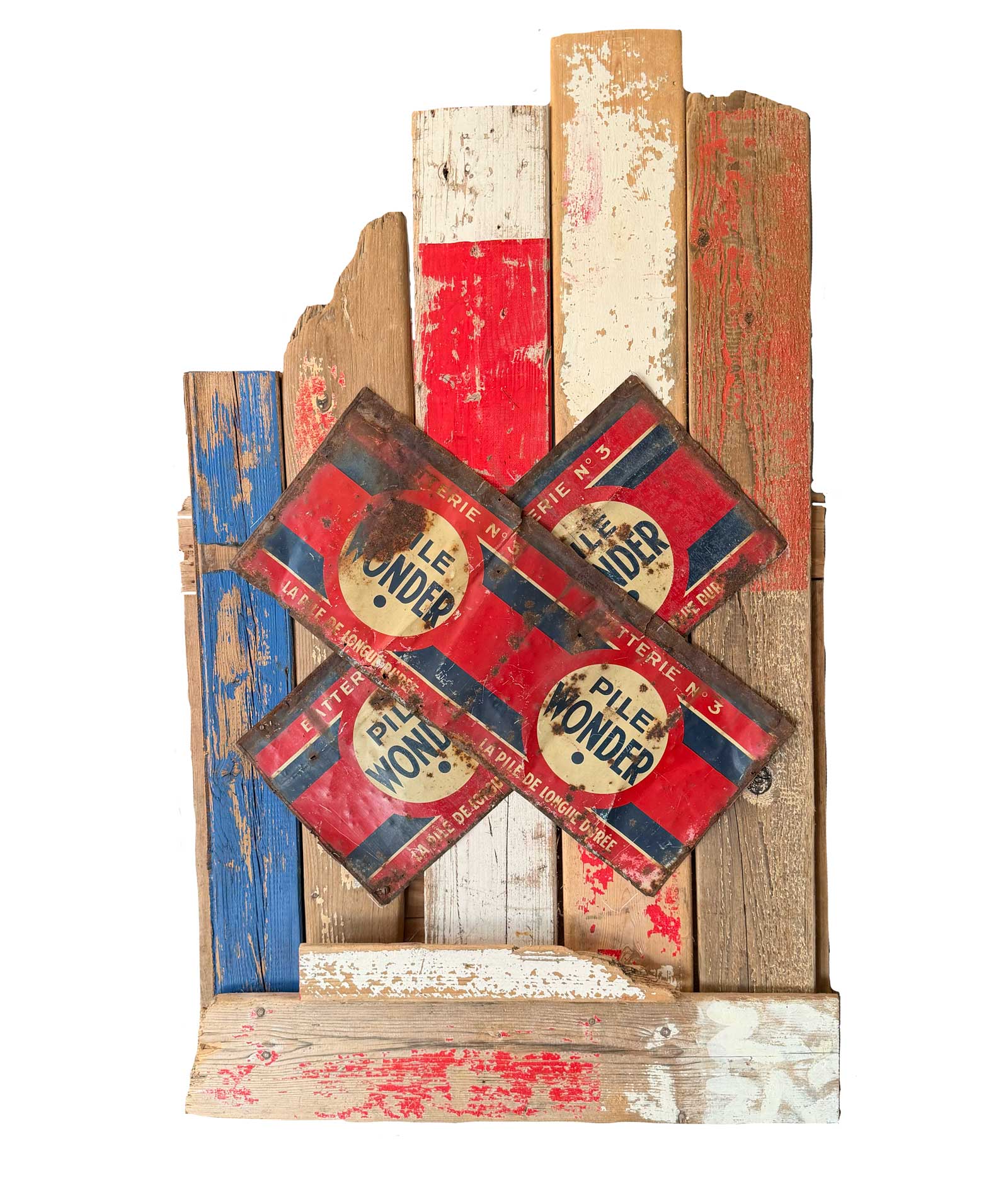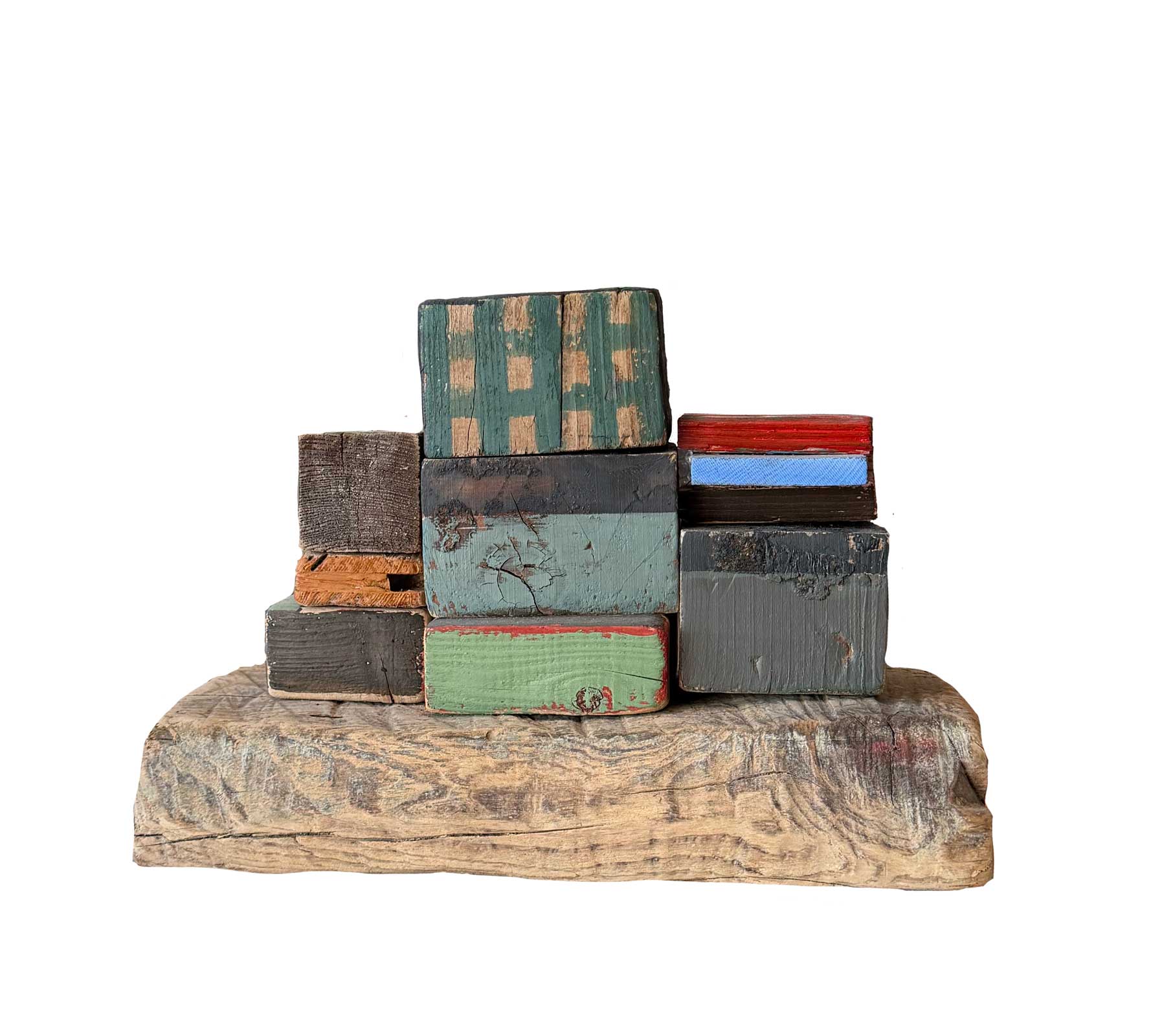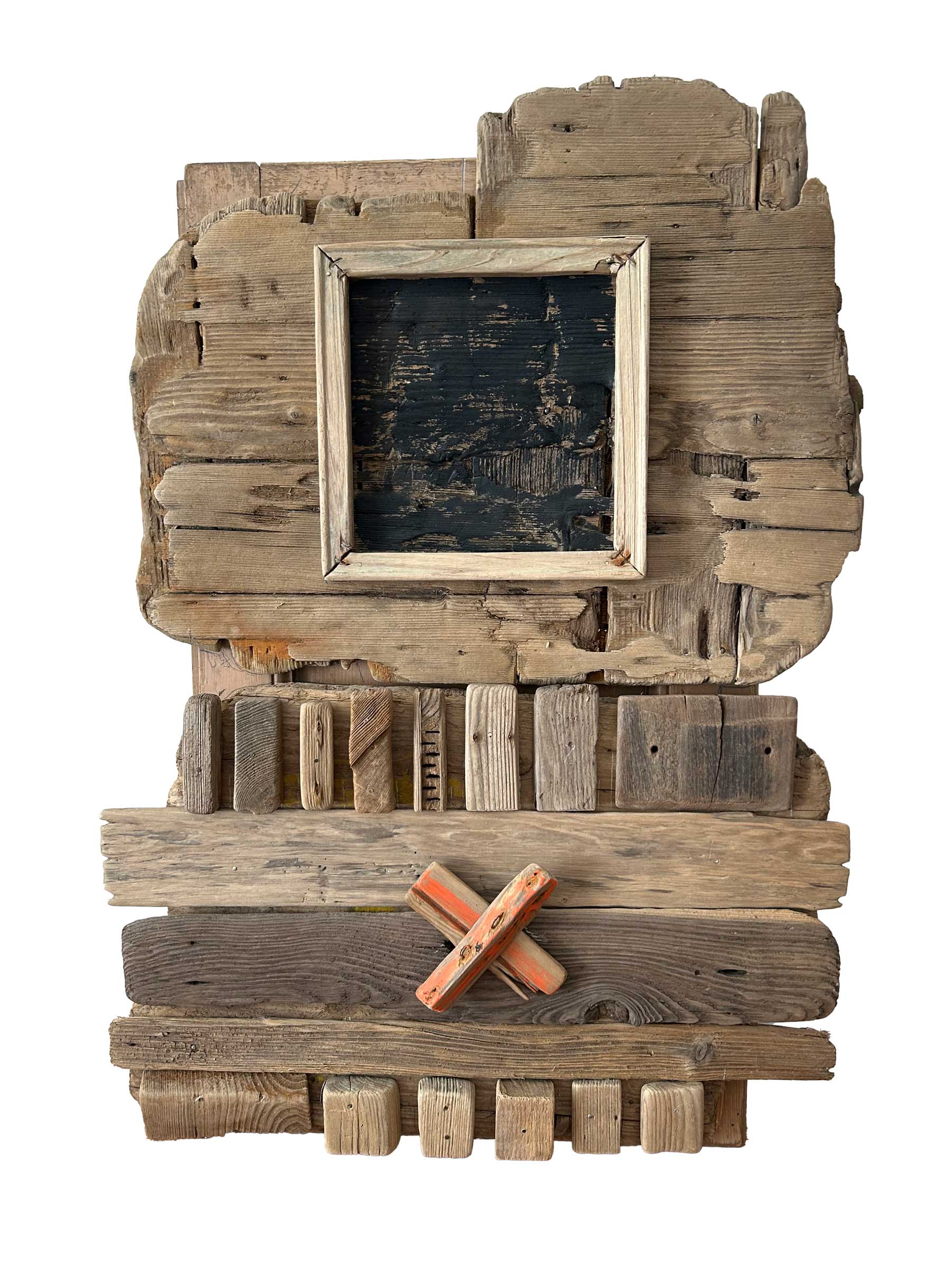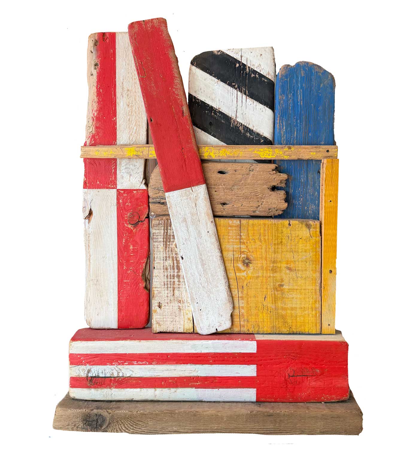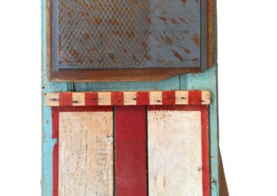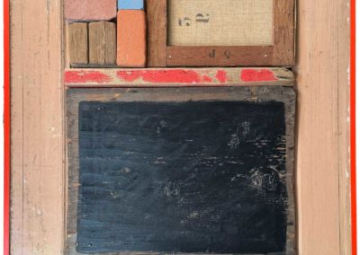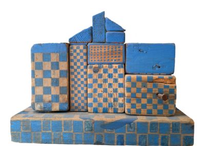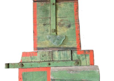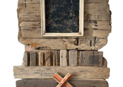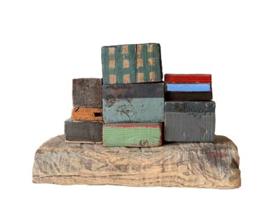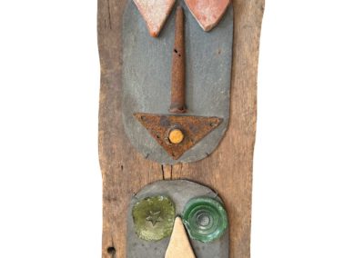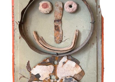 Connue d’abord pour ses peintures à la frontière entre le pop art et l’hyperréalisme, Emilienne Farny se distingue dès les années 2000 avec une production nouvelle : ses assemblages. Chez l’artiste, cette technique procède en deux temps. Le premier est celui de la balade et de la collecte. C’est le temps de l’émerveillement. Au gré des sentiers, l’artiste amoncelle divers objets dont elle fait la collection : cailloux, pièces de métal, débris rouillés, déchets de plastique, planches, bois flottés, autant de fragments de l’expression urbaine laissés à l’abandon et qui segmentent la trajectoire des promeneurs. S’en vient ensuite le temps de la composition, celui de la réunion de ces résidus en un tout qu’est l’œuvre d’art. Sous l’entrée « assemblage », le Dictionnaire de l’Académie française propose la définition suivante : « se dit surtout de la réunion d’objets hétéroclites produisant un tout bizarre ». Bizarre, certes, en ce que rien ne prédestinait ces débris à l’assemblage, mais non moins cohérents, sinon harmonieux. C’est bien là l’essence même des assemblages d’Emilienne : parvenir, à partir du désordre du monde, à une unité nouvelle.