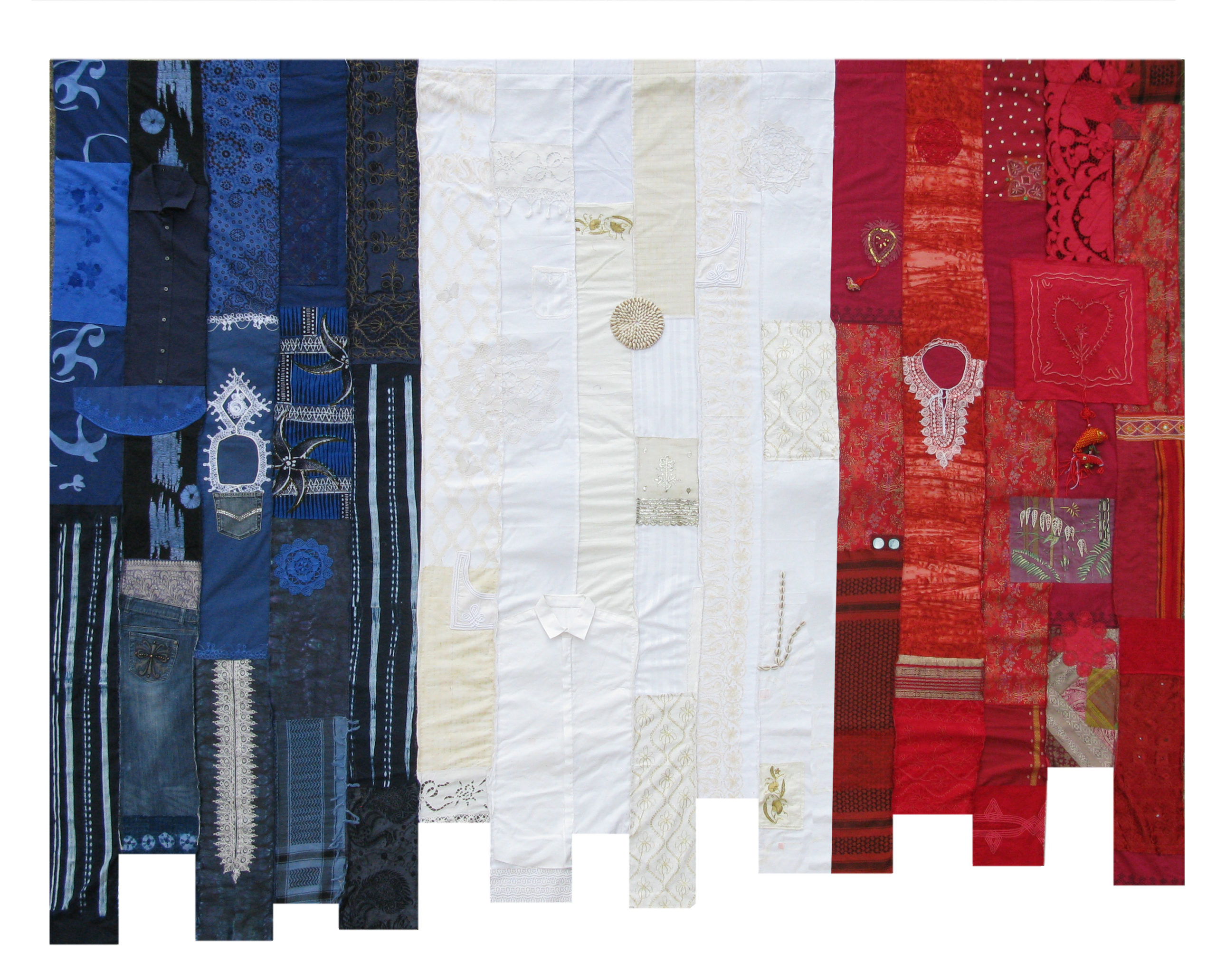 La plasticienne Christine Matthey-Isperian travaille depuis plusieurs années avec des tissus qu’elle assemble: broderies de boubou, foulards fleuris des Balkans, batiks asiatiques, soies indiennes, guipures colorées et exotiques.